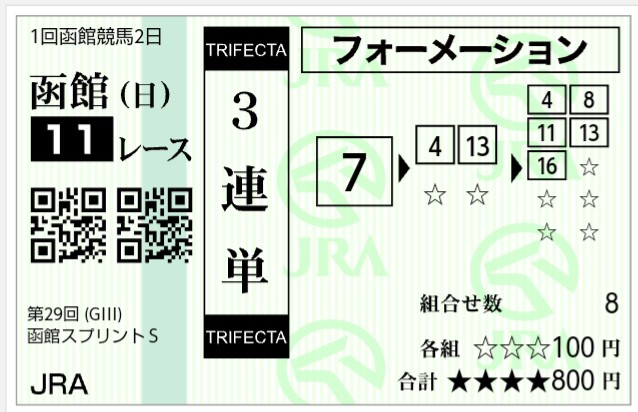 @ynwaanfield1892今日は久々に重賞2つとも当たったな~😊😊エプソムカップは1番人気の馬は最初から買い目に入れず、ダーリントンホールからいってギリギリ3連複をゲット。函館SSは単勝、馬連、3連複と取ったけど、2、3着が人気ないのに配当は安かった😅😅来週も当てるぞ~😊