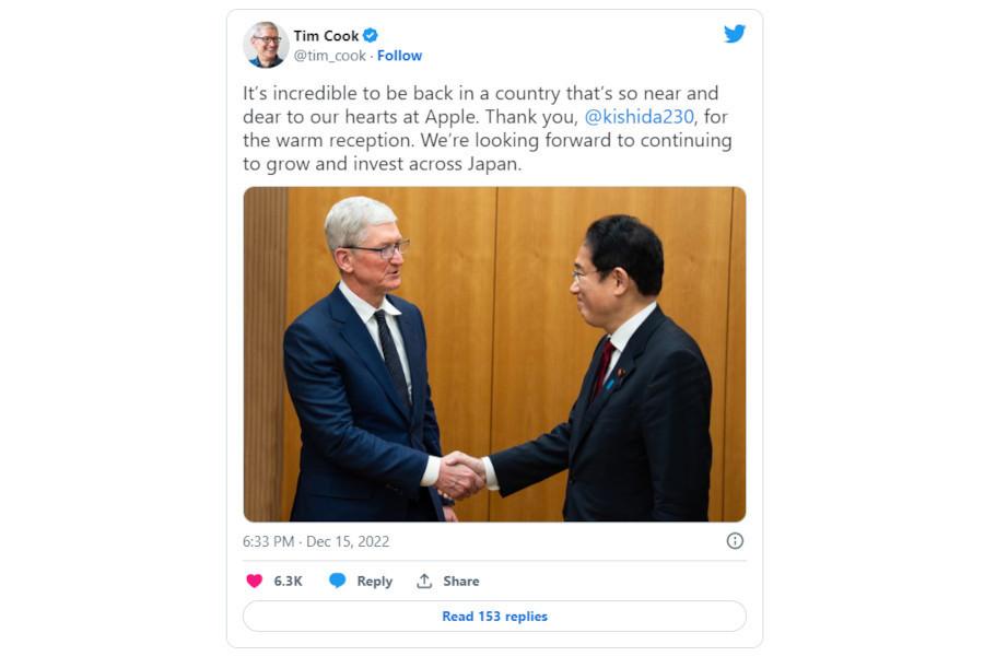 (Appleにとってとても近く、私たちの心にとって大切な国に戻ってくることができて信じられないほどです. @kishida230 さん、温かい歓迎をありがとうございます。 今後も成長を続け、日本中で投資を続けていくことを楽しみにしています。 pic.twitter.com/vxUF3nVYOV