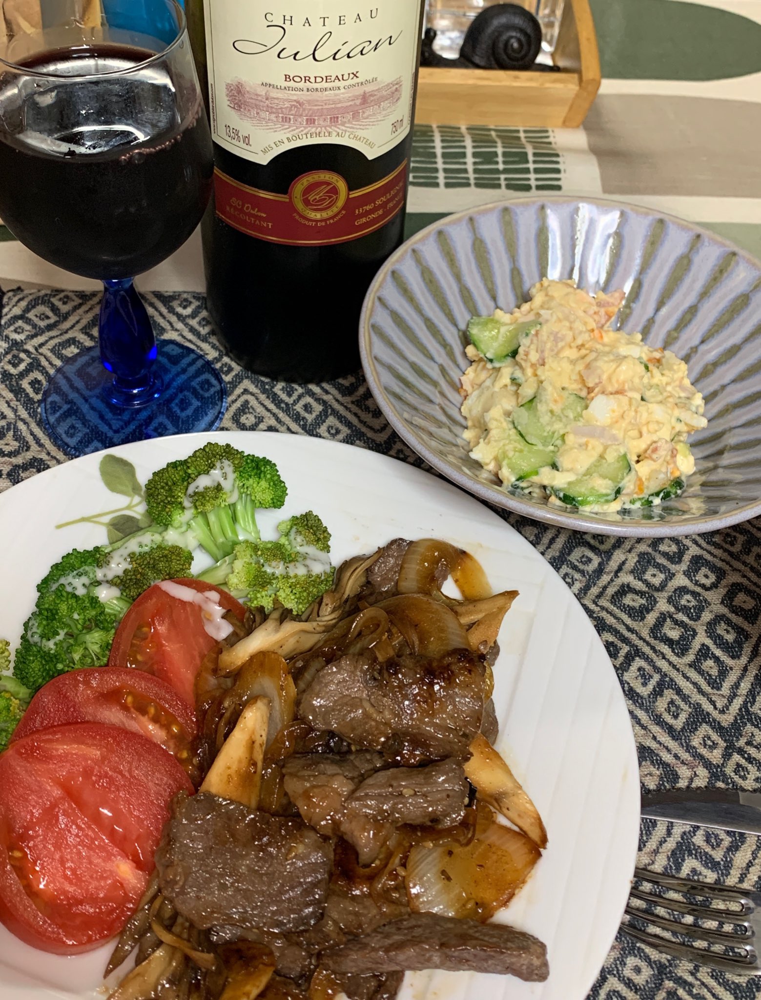 @yamajajanお疲れ様です😊今夜は肉、玉ねぎ、ポテサラ🍷✨そして今夜のメインはWBAスーパー、WBC、IBF世界バンタム級王座統一戦🥊井上尚弥VSノニト・ドネア(^∇^)やっとこの日が来た✨楽しみですな♫