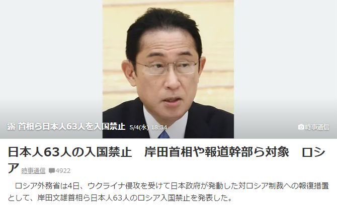@9NA3NL3JDOVc4n7日本人63人の入国禁止 岸田首相や報道幹部ら対象 ロシア(時事通信)#Yahooニュース 鈴木宗男氏は? コメントが欲しい。 https://t.co/3MkH4wrddv