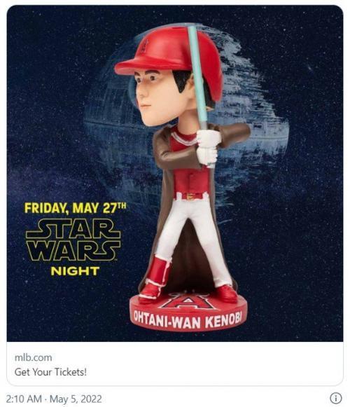 ロサンゼルス・エンゼルスが5月27日に本拠地のエンゼル・スタジアム・オブ・アナハイムで開催する試合で、オビ=ワン・ケノービ風にデザインされた大谷翔平選手のボブルヘッド人形「Ohtani-Wan Kenobi」が配布されます。