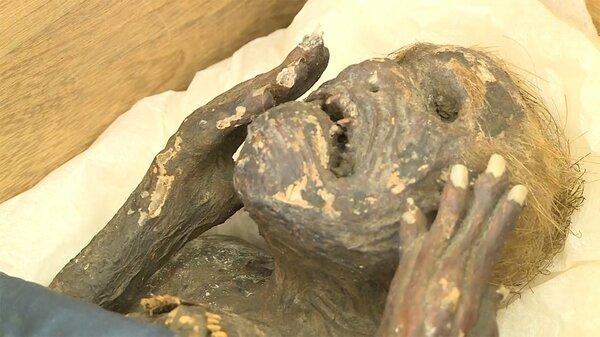 詳しく調べた結果、ミイラには頭蓋骨や肋骨などの主な骨格がなかったことや、体の内部に布や綿が詰め込まれていたことがわかったほか、肩にはフグ科の魚類の皮が使われていたという。