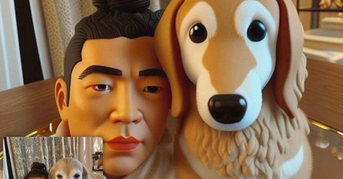 AIでアニメ風のアバターを作ることのできるアプリ「Voila AI Artist」で愛犬との2ショットを加工したところ、石田さんの代わりにゴツいおじさんが出現したことを伝えています。