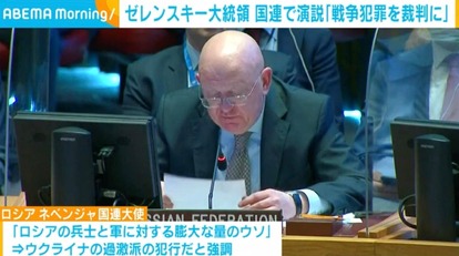 演説の後、虐殺されたとみられる市民の遺体の映像が流されたが、ロシアの国連大使は「ロシアの兵士と軍に対する膨大な量の嘘だ」と反発し、ウクライナ過激派による犯行だと強調した。また、軍事作戦が速やかに進んでいない背景として、「民間人を標的にしていないからだ」と主張した。(ANNニュース